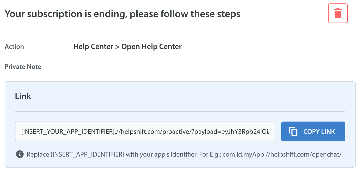 handleProactiveLink(<PROACTIVE_LINK>,<LOCAL_API_CONFIG>)function.We will read the data from the link you provided and open Helpshift support with the configurations you provided while generating the link from the dashboard.